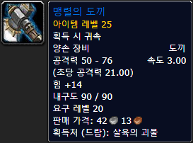 그림자송곳니 성채의 "살육의 괴물"을 처치 시 "맹렬의 도끼"를 일정 확률로 드랍합니다.