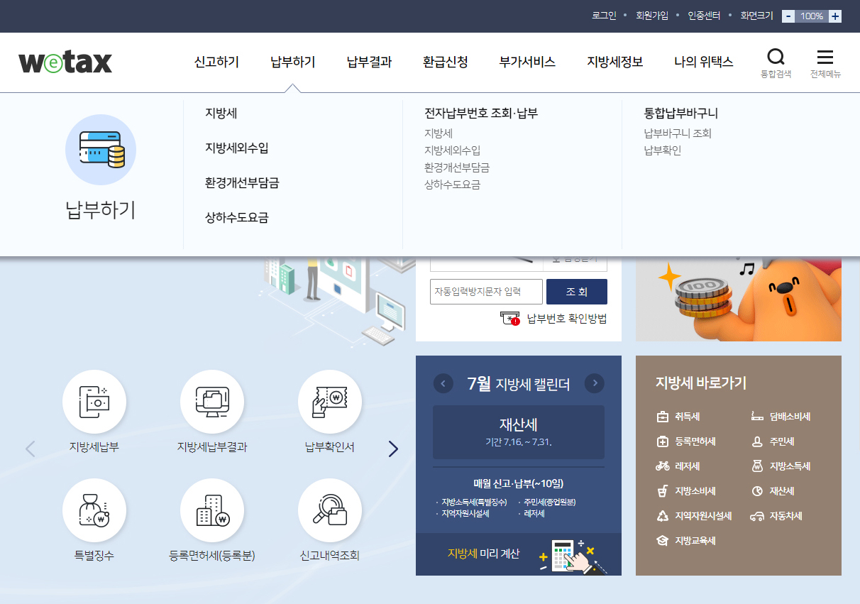 재산세는 위택스 홈페이지 및 어플 > 납부하기에서 납부가 가능합니다.