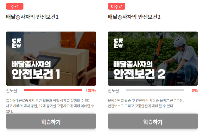 첫 배달 수행 5,000원과 친구 초대 이벤트에 참여하기 위해서는 배달 전 안전보건교육을 시청하고 수료해야 합니다.