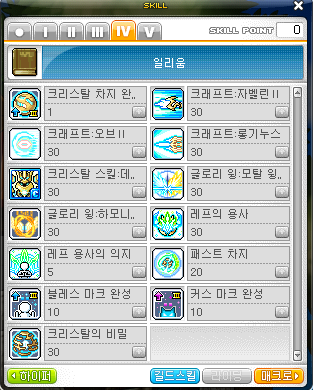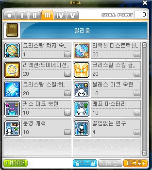 리액션 : 디스트럭션II 1 > 리액션 : 도미네이션II 1 > 크리스탈 스킬 : 글로리윙 1 > 끊임없는연구 M > 운명개척 M > 레프 마스터리 M > 블레스 마크숙련 M > 커스 마크숙련 M > 리액션 : 디스트럭션II M > 리액션 : 도미네이션II M > 크리스탈 스킬 : 글로리윙 M > 크리스탈 스킬 : 하모니링크 M