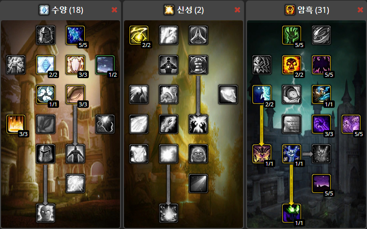전장이나 전쟁에 특화된 특성이 아닌 빠른 레벨링을 위한 18/2/31 암흑 위주의 특성 트리입니다.