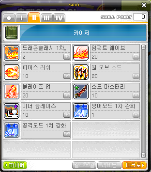 피어스 러시 1 > 임팩트 웨이브 1 > 드래건 슬래시 1차 강화 M > 윌 오브 소드 1 > 블레이즈 업 M > 공격 모드 1차 강화 M > 소드 마스터리 M > 방어모드 1차 강화 M > 이너 블레이즈 M > 임팩트 웨이브 M
