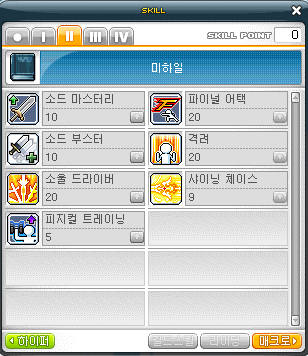 소울 드라이버 1 > 샤니잉 체이스 1 > 소드마스터리 5 > 소드 부스터 M > 피지컬 트레이닝 M > 소드 마스터리 M > 격력 M > 파이널 어택 M > 소울 드라이버 M > 샤이닝 체이스 M
