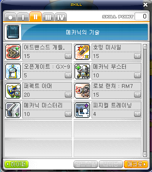 어드밴스트 개틀링 샷 1 > 호밍 미사일 1 > 메카닉 마스터리 5 > 메카닉 부스터 M > 메카닉 마스터리 M > 피지컬 트레이닝 M > 로보 런쳐 : RM7 M > 호밍 미사일 M > 오픈 게이트 : GX-9 M > 호밍 미사일 M > 오픈 게이트 : GX-0M > 어드밴스트 개틀링 샷 14> 퍼팩트 아머 M