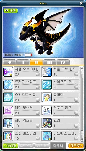 서클 오브 마나 II 1 > 서클 오브 윈드 1 > 드래곤 스위프트 1 > 서포트 점프 M > 스펠 마스터리 M > 매직 부스터 M > 하이 위즈덤 M > 서클 오브 윈드 M > 드래곤 스위프트 M > 교감 M > 서클 오브 마나 II M