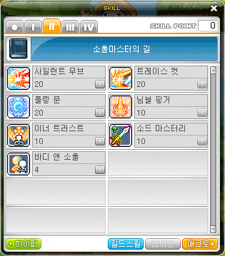 폴링 문 1 > 트레이스 컷 1 > 사일런트 무브 1 > 소드 마스터리 5 > 님블 핑거 M > 소드 마스터리 M > 이너 트러스트 M > 바디 앤 소울 4 > 트레이스 컷 M > 폴링 문 M > 사일런트 무브 M